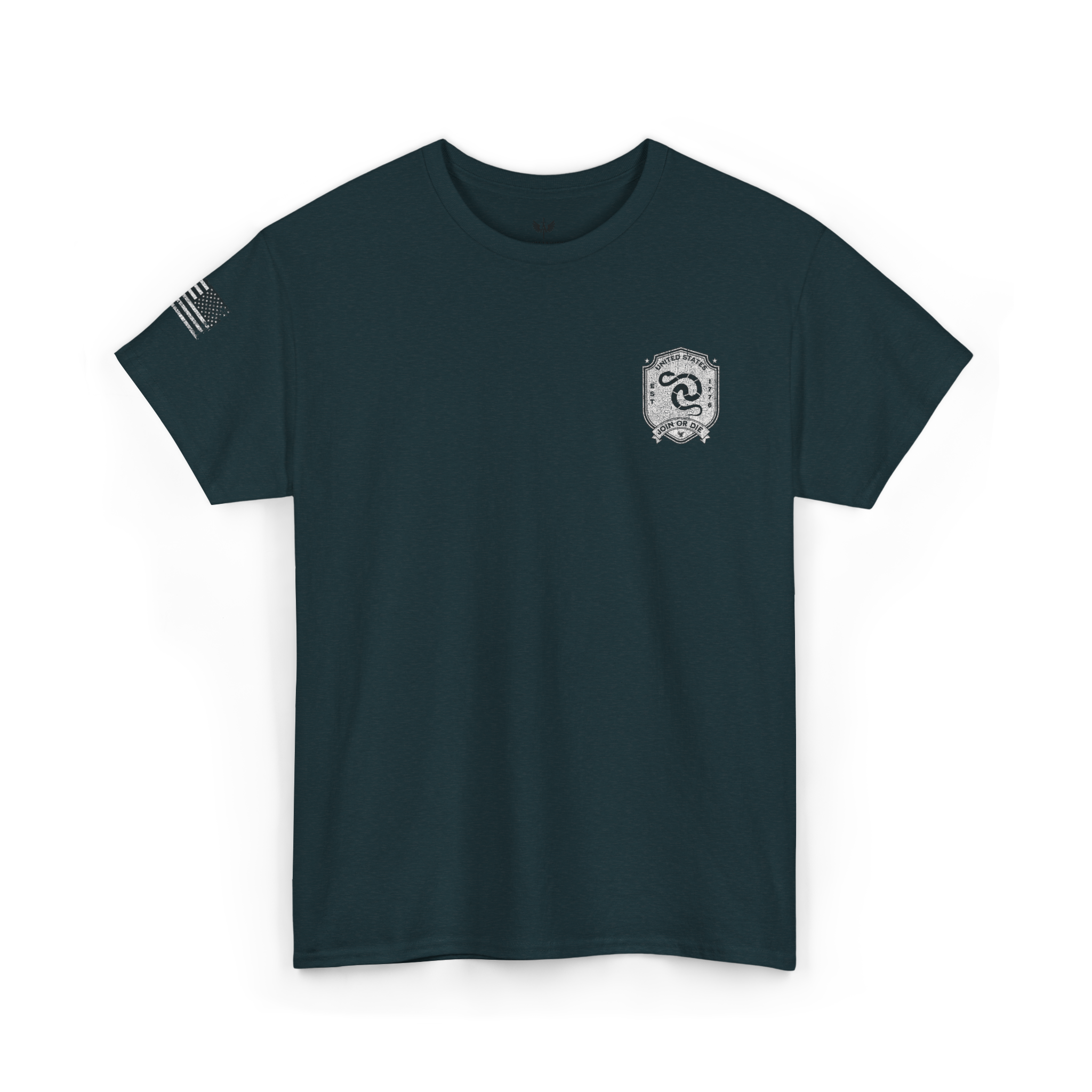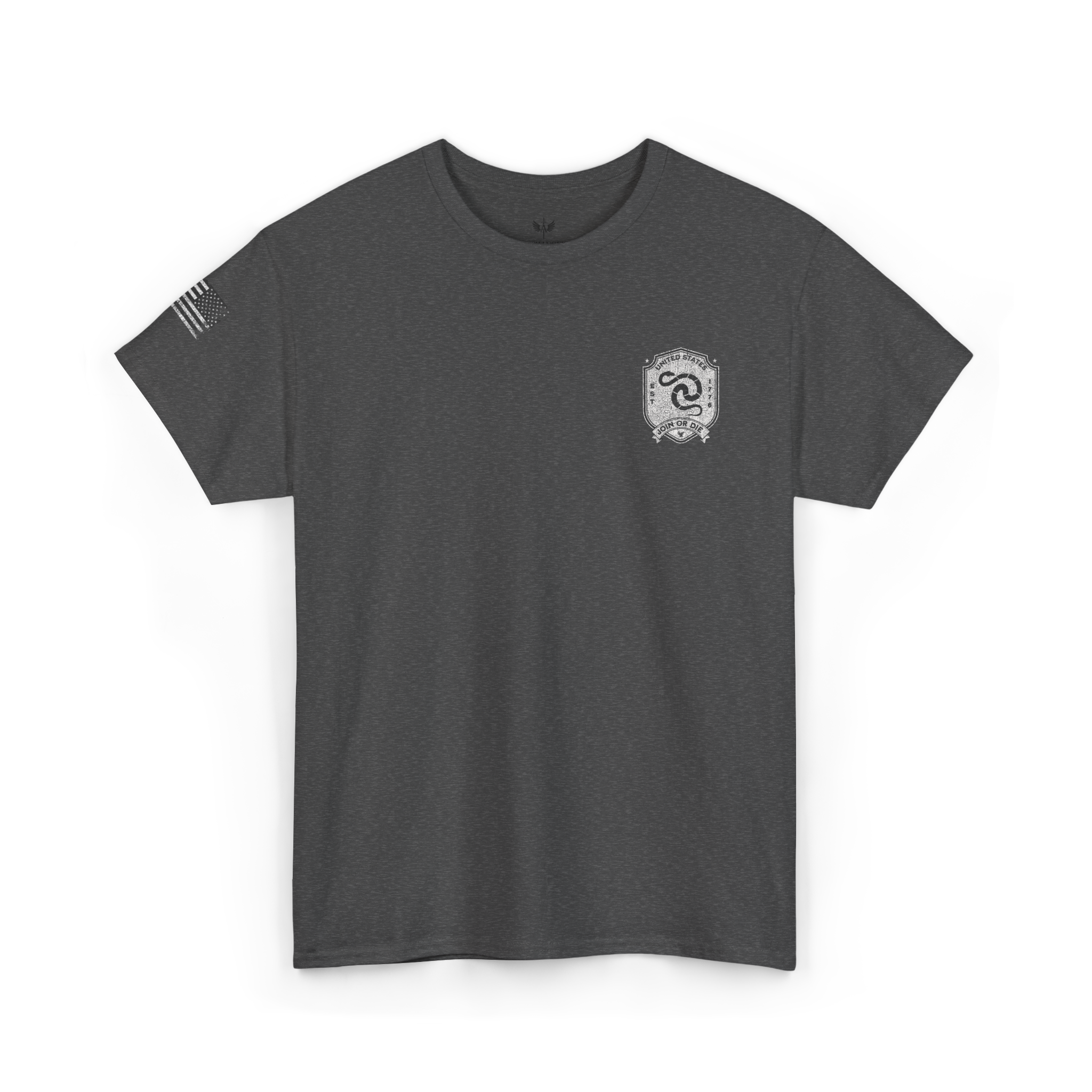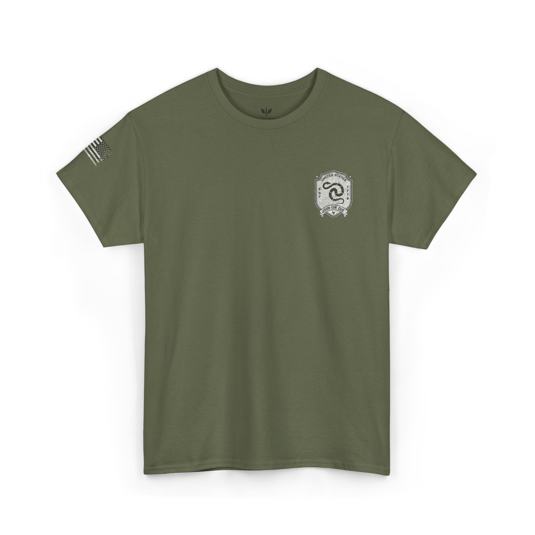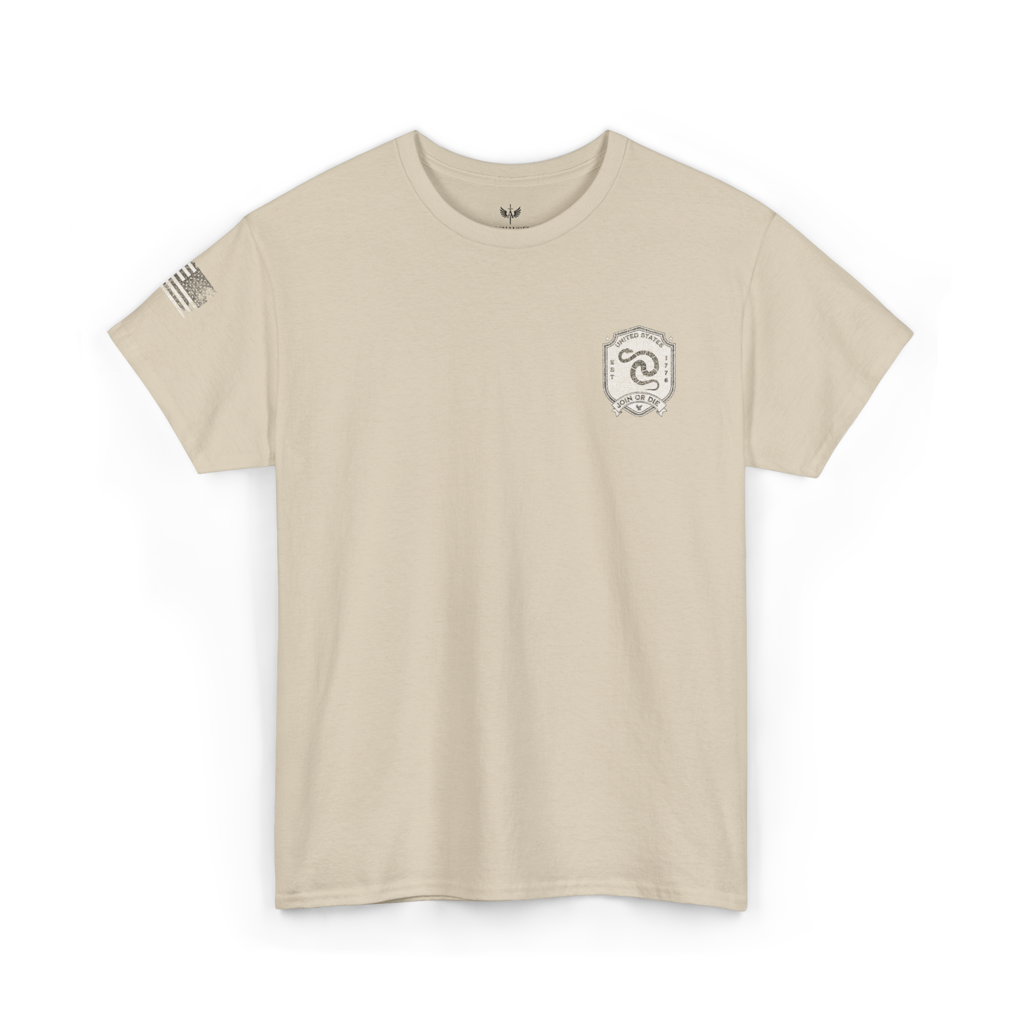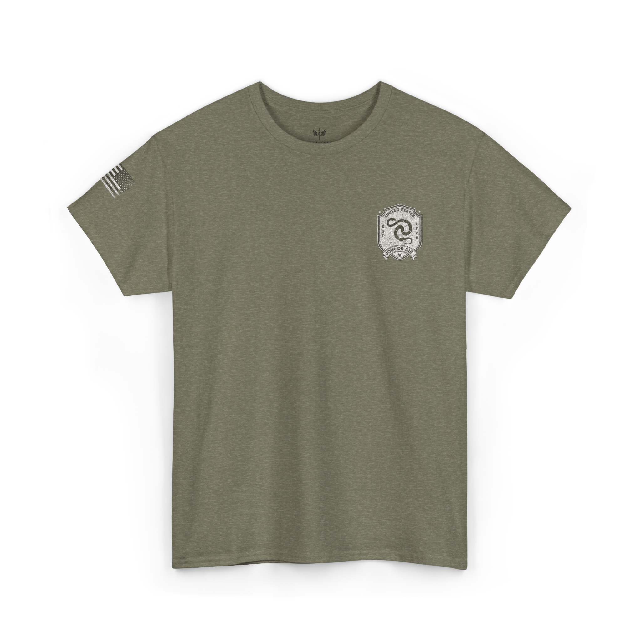 "Join or Die," inspired by Benjamin Franklin’s iconic political cartoon, urging unity in the face of a growing threat against the American colonies. The design shows a segmented snake - each piece representing a different American colony symbolizing the critical need for unity. A reminder that true strength lies within the hearts and minds of the people. "I only regret that I have but one life to lose for my country.”